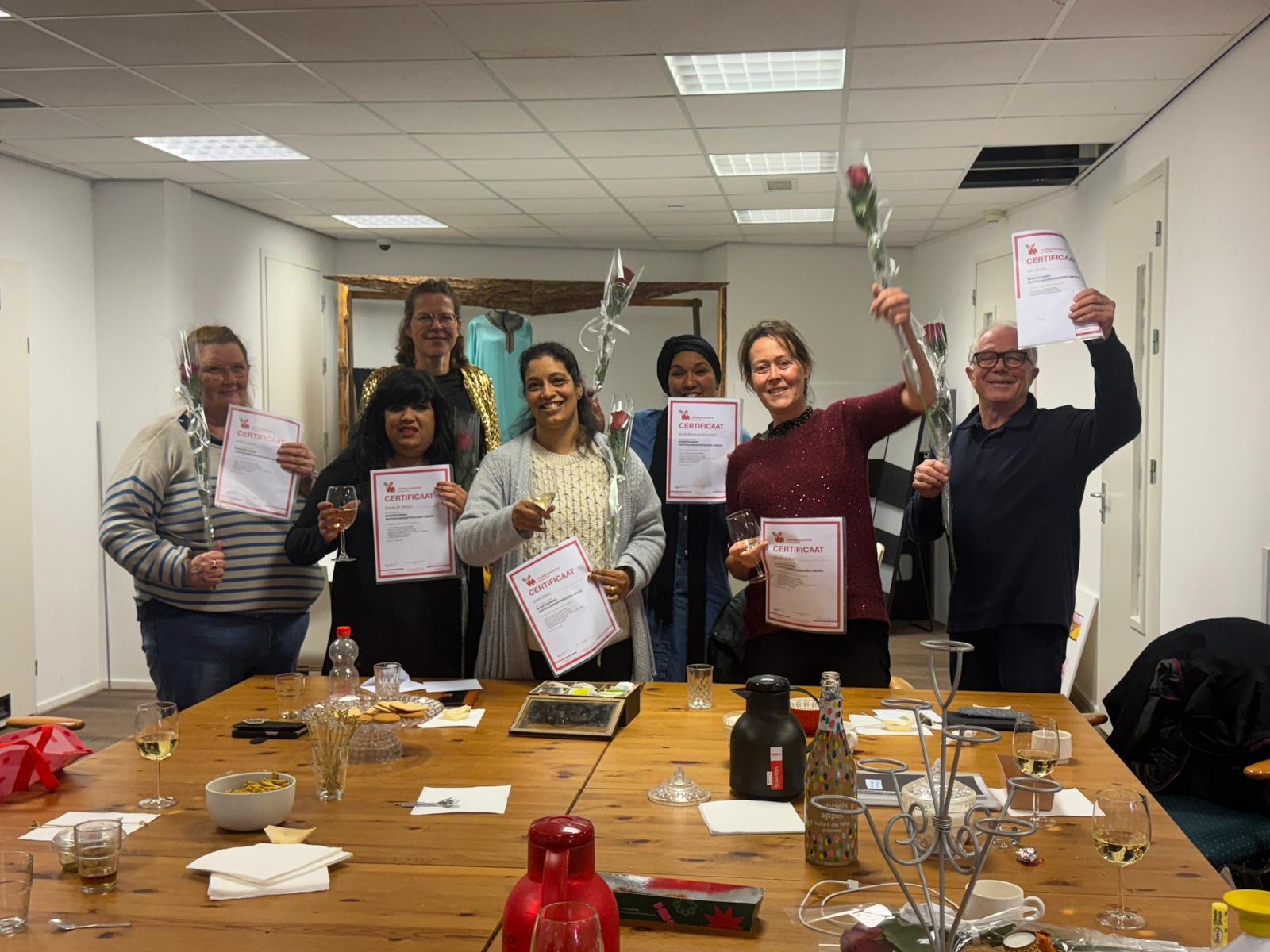 Wat een mooi moment! 🎉Afgelopen week hebben Barbara, Ambili, Mireille, Prya en Han het certificaat voor Vertrouwenspersoon ontvangen. Iedereen is geslaagd! De training werd gegeven door Esther, de lange vrouw